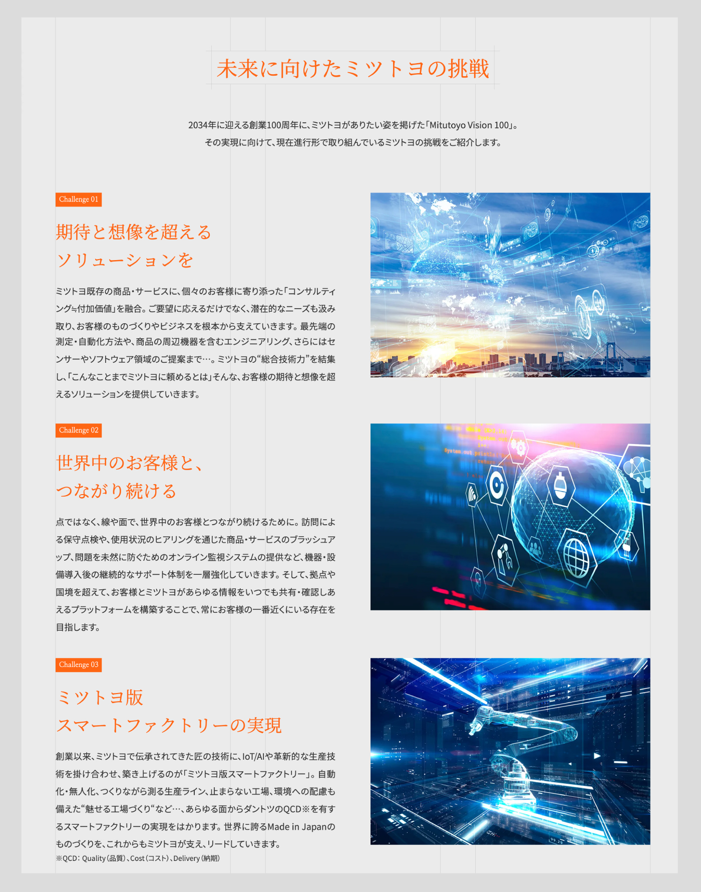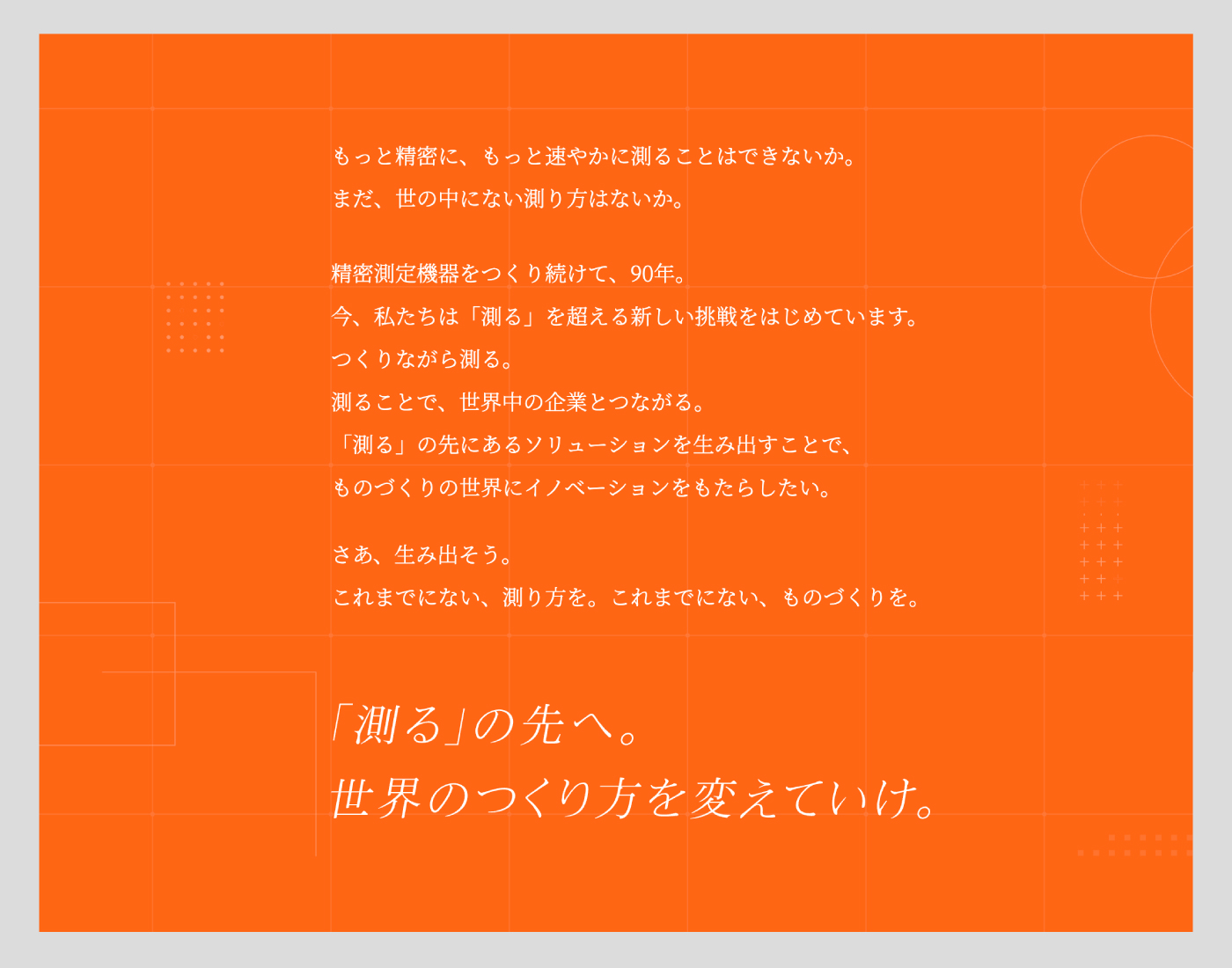 株式会社ミツトヨは、精密測定機器の世界的リーディングカンパニー。90年以上の歴史を重ねながら、今もなお、メーカーの枠を超えた新たな挑戦を続ける同社の新卒・キャリア採用サイトを制作しました。「“測る“の先」をキーワードに、工場の自動化といった最新のイノベーション事例をはじめ、全国に広がる各拠点の特色や、暮らしの舞台となる街、従業員の想いなどを紹介。ミツトヨが見据える未来や、そこで働く自分の姿を具体的にイメージできるサイトを目指しました。
