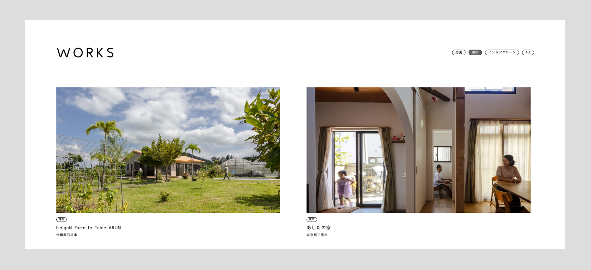 造園を手がけるランドスケープデザイナーの旦那様と一級建築士の奥様のおふたりが中心となって活動する株式会社SORRA。同社の特徴は、庭と建築を個別に設計するのではなく、ひとつの空間の広がりとして捉えてプランニングができること、また、お引き渡し時に完成するのではなく、長い時間をかけ、四季のうつろいの中でご家族といっしょに空間が育っていくという考え方でした。今回リニューアルした企業HPは、そんな“広がり”とおふたりのおだやかなご性格を感じさせるデザインとコピーでつくられています。